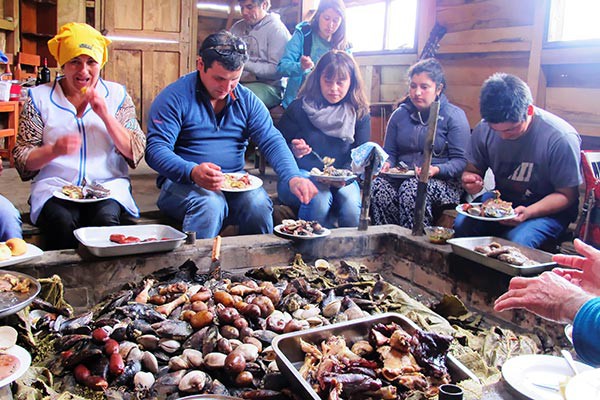 Balade de découverte au cœur de cette minuscule île. Préparation du curanto élaboré avec les feuilles de pangue, dégusté au son de la valse chilote. Ambiance, musique et convivialité…